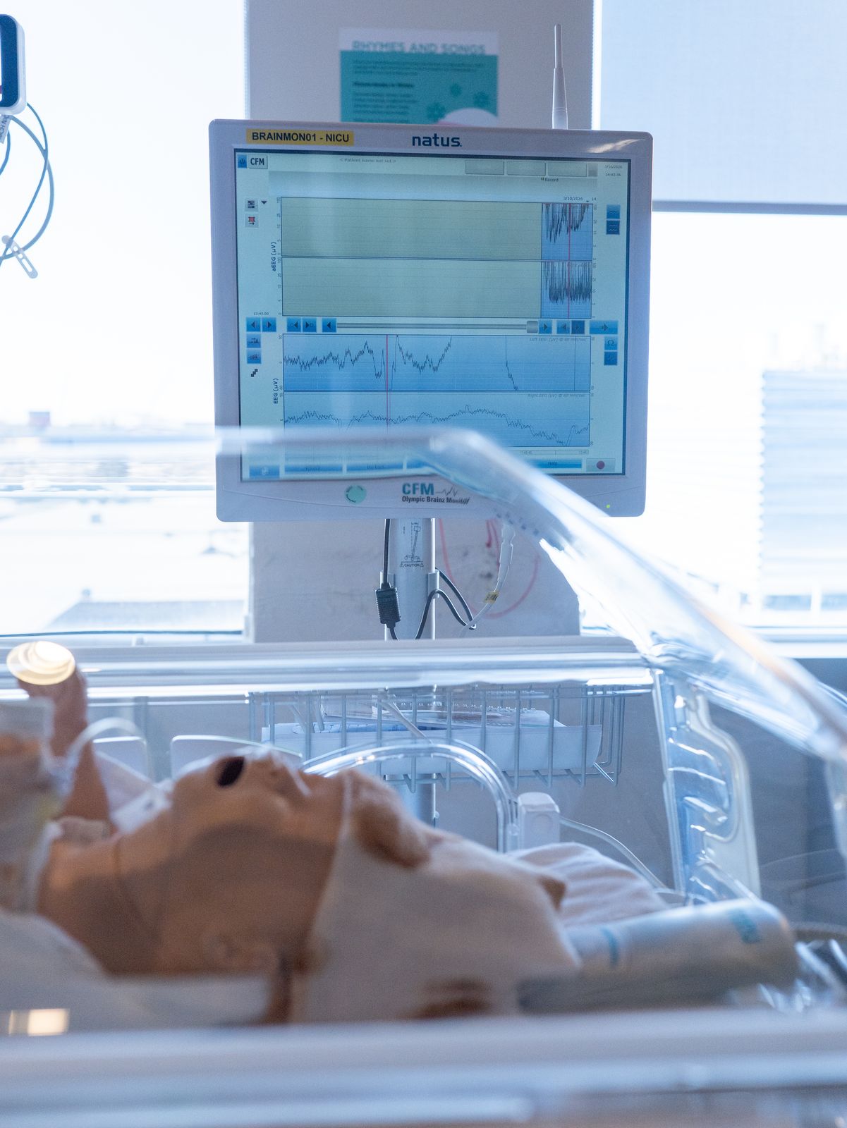The aEEG monitor tracks a baby’s brain activity over time, helping clinicians identify patterns that may signal seizures or reduced oxygen to the brain.